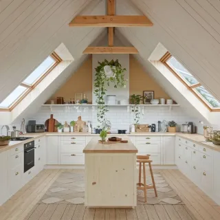- Dans une cuisine mansardée, une fenêtre de toit est une solution astucieuse pour capter la lumière naturelle.