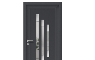 Porte d'entrée moderne gris foncé avec une poignée argentée et trois bandes horizontales en métal.