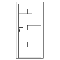 Porte d'entrée moderne blanche avec cinq fenêtres rectangulaires et une plante verte en pot à proximité.